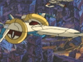現サイバトロン軍が有する主力戦闘機。小型の一人乗りタイプで、水色を基調とした機体色が特徴。乗降の際にはキャノピー部が展開する。セイバートロン星の引力圏から単独で宇宙空間に離脱することができる。主武装として機首部にはマシンガンを装備する。広域破壊用のミサイルも搭載しており、機体下部のハッチを開き投下することが可能(画像右)。コクピット内部のキャノピー部には仲間からの通信などの様々な情報を表示可能となっている。ユニクロンとの戦闘時に多数が運用されている。TF連合軍の指揮官となったホットロッドやランページなどが使用し、活躍した。ユニクロンの体内に侵入し、ミサイルによる攻撃を加えるなどしている。 |