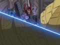 ダブルフェイスの「剣と盾、そして銃、互いに反発し合う3つの力」という言葉をヒントに、スラストは3体のマイクロンが合体した3つの武器も、一体となり凄まじい力を発揮するのではと考える。その推測を裏付けるかのように、火星軌道上でスターセイバー、コスモテクター、アストロブラスターが合わさった時、凄まじいエネルギー波が発生した。スラストは、3つの武器からなる強力な兵器の開発を構想し、彼の指揮の下、アイアンハイド達少数のデストロンによってそれは製造されたようだ。そしてスラストは、サイバトロン軍が持つスターセイバーとコスモテクターを手に入れるため、サイバトロン側にいるスタースクリームに揺さぶりをかけるのであった…。