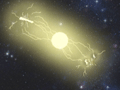 ヒュドラキャノンの試し撃ちの標的となった彗星。その昔より凶兆として忌み嫌われているため、吹き飛ばして吉兆に変えようと言うスラストの提案で選ばれた。地球のマウント・アストロゲート周辺では夕方から彗星を観ることができ、大勢の天文家が望遠鏡を覗き込み、ラッド達5人も近くの岩場で眺めていたが、彼らの眼前で突如彗星は爆発した。それはヒュドラキャノンによって引き起こされたものであり、その後彗星は完全に消滅したが、その原因を突き止めることができた地球人はラッド達だけであった。その爆発は彗星を観測していたコスモスコープ研究所のコンピュータを故障させ、爆発で生じたプラズマ粒子の影響か、一時的に地球の多くの地域(低緯度地域でも)でオーロラのような現象を発生させている。 |