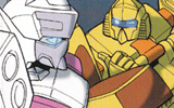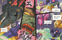 サーボの言う、レッドラインがリンケージの中で見た“恐ろしいもの”とは、“ユニクロンの存在”のようです。そういえば、PART7の2ページの2コマ目でも、“ユニクロンの目”と思しきものが確認でき、それにレッドが気づき振り返る場面が存在します。マイクロン達はこの時まで、自分達の種族がユニクロンによって創造されたことを、知らなかった(あるいは忘れていた)のでしょうか?上記の“夢物語”の件もそうですし、今まで彼らはユニクロンの存在に考えが及んでいなかったようなので(PART1ではフィクサーバグに追跡されていたフラットアウトが、「デストロンの追手か?」と発言してますし)、その可能性が高いかも。 やはり前回レッドライン達がやった“リンケージに意識を拡張し投入する”行為は、マイクロン種族の中でレッド達が初めて行ったことのようです。もし以前に同様の行為がされていれば、マイクロン達は既にユニクロンの存在を知っていたはずですからね。まぁ、マイクロン種族の歴史はその大半が(約400万年もの間)休眠状態だったので、そのような行為がされなかったのも無理からぬことと思います。 そして物語には、新たに「マスターキー」なるものが登場です…。「変化に備えてくれ」というサーボのセリフで思いましたが、やはりTFの物語は、“変化”が重要な要素です。「トランスフォーマー=変化するもの」だから、当たり前かもしれないけど。 「エボリューション(進化)」という言葉は、『マイクロン伝説』の重要なキーワードの一つですが、そこでいうエボリューションは基本的にマイクロンとの合体によって、“大型TFが”進化することを指すものでした。なので、“マイクロン達自身の進化”というのは、面白いですね(しかも、アニメともちゃんとリンクした展開だったりします)。 ファルシアはリンケージに意識を投入した一件によって、以後はレッド達に協力することを決意した様子。しかしトゥワール、前回の最後のネタをまた…。“家族”ってオイ(笑) 今回はラストに、新マイクロン部隊・アクアレイダーチームが登場。また、PART4のデバスターに続き、アニメでお馴染みのダブルフェイスも登場です。トップギアに渡された謎の結晶体は、のちに“恐るべきもの”であることが発覚することになります…。 補足:最後のページには、「ソニックアサルトチーム」のキャラクターバイオがあります。ファルシア達のチームですが、劇中チーム名は登場していません。バイオによると、リーダーはやはりコンバスタで、彼女達は過去の戦闘の過酷な体験から、デストロンに対し強い復讐心を抱いているらしいです。そのためモットーは、「我らが報復は素早く確実だ!」です。PART5でのファルシアの最後のセリフは、そういった経緯からのようです。 ‐‐‐‐‐‐‐‐‐‐‐‐‐‐‐‐‐‐‐‐‐‐‐‐‐‐‐‐‐‐‐‐‐‐‐‐‐‐‐‐ ■PART9 あらすじ:レッドライン達は、マイクロンのスパーク・フレームを改良する“進化の方程式(マスターキー)”を編み出した。彼らはマイクロンを“進化”させるため、施術を実行に移す。だが、そこに宿敵・マグナウィングが飛来し、謎の大型TFを解き放った…! ストーリー詳細 レッドライン「ステラ、少しのあいだ、このパネルを預かっててくれ」 ステラ「いいわ。でもちゃんと引き取りに戻ってよね…」 レッドライン「じゃあいよいよ始めるぞ!進化の準備はいいかい、コンバスタ?」 コンバスタ「あいよ、若旦那!」 レッドラインは、胸の2枚のパネルをステラに預け、 コンバスタと共に、マイクロンを“進化”させるための施術を実行に移す…。