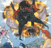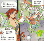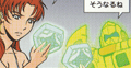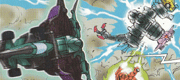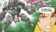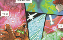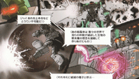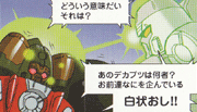 レッドライン「奴は僕にまかせろ!それよりも── 進化の方程式(マスターキー)を“リンケージ”のデータベース階層に 転送した。還元再起動モードを実行すれば、他のみんなも アップグレードが可能になる!だから──君はリンケージを通じて、 すべてのマイクロンに呼びかけてくれ。今が進化の時だと!」 (ラヴィナスを追い、飛び去るレッドライン) サンバーン「<さあて、果たして間に合うかしら?>」 コンバスタ「どういう意味だい、それは?あのデカブツは何者? お前達なにを企んでいる、白状おし!!」 (進化により手にした力でサンバーンを尋問するコンバスタ)