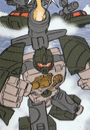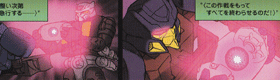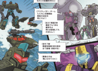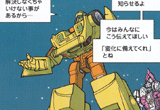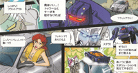 「<ラヴィナス体内の神経回路には、あの方より給わった “破滅の種子”が繋がれている。それはお前たちのリンケージを破壊するに 十分なパワーを秘めた結晶体──。捕獲した“エントランス”を 通じ、この力を解き放てば、忌々しい集合体は砕け散り、 お前たち裏切者のマイクロンすべての心も、共に死に絶えるのだ!!>」 感想&解説 大型TFの「エボリューション」という起動コードによって、合体コマンドが働き、反射的に合体を行ってしまうマイクロン達──この“エボリューションの機能”を利用した展開は上手いと思います。PART9でレッドラインが「僕らのシステムは全てにおいて、この目的を優先する」と言っているように、エボリューション機能は一度働くと、彼ら自身ではコントロールすることの難しいものであることが改めて理解できます。大型TFを強化するその機能は、本来“TFの戦争を激化させるための邪悪な機能”なわけですね。なお、進化を果たしたマイクロン達は、その“枷”をも振り払ったようです。自分の意志での合体及び大型TFの強化は可能のようですが(アニメ第48話のグリッドのように)。 ステラの愛車の変形も、エボリューション機能によるもののようです。PART1のターボキャノンと全く同様に、車全体の改造(分子モディファイ)が行われたものと考えられます。なお今回この自動車には、PART1の時点では無かった車体側面にもマイクロンジョイントがあるので、キャノンの改造の際に既に全体が改造されていたわけではないようです。多分本エピソードの少し前に、あらかじめマイクロン達が改造しておいたものと思われます。 ラヴィナスと戦い、見事サーボを救い出すことに成功するステラですが、女性が強いのは、TFシリーズの伝統でしょうか?(アニメのアレクサ大統領も…笑) PART8の最後で言っていたアップグレード達の“作戦”とは、捕獲したトゥワールをリンケージへの“入口(エントランス)”として使い、その中に強力な「破滅の種子」の力を解き放つことで、裏切者のマイクロンの“心の集合体を破壊”=マイクロンを殲滅するというもののようです。ユニクロンにとって、既にマイクロンは“用済み”となっていたわけです…。 サンバーンのセリフの「覚醒に必要な三つの鍵」とは、スターセイバー、コスモテクター、アストロブラスターのことです。また、サンバーンが異様に饒舌なのは、進化を果たしたマイクロンの超絶的な能力によるものとみられます(コンバスタからサンバーンに、緑色の光が発せられています)。その力(尋問)は、PART11でも使用されています。 ‐‐‐‐‐‐‐‐‐‐‐‐‐‐‐‐‐‐‐‐‐‐‐‐‐‐‐‐‐‐‐‐‐‐‐‐‐‐‐‐ ■PART11 あらすじ:敵の黒幕は“ユニクロン”だった。リンケージの破壊を阻止するため、レッドラインはラヴィナスを追跡する。一方他のマイクロン達は、続々と進化を果たしていた。破滅の種子が解き放たれる直前、進化したマイクロン達により、辛うじて危機は免れるのだった。 ストーリー詳細 (ラヴィナスを追うレッドラインに、通信機で呼びかけるコンバスタ) コンバスタ「聞いたかい、レッドライン?」 レッドライン「ああ!これではっきりしたな。あいつが──ユニクロンが僕らを 始末しようとしている!リンケージの破壊など、許すものか!」