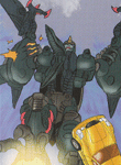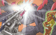 その光は、進化したマイクロン・キングボルトだった! キングボルトの電光石火の蹴りは、間一髪、 ラヴィナスからトゥワールと破滅の種子を切り離す。 レッドライン「キングボルト?!あなたか?!」 キングボルト「つもる話はあとだ、レッドライン!今は共に 力を合わせ、この大敵を討つのだ!」 キングボルトはラヴィナスを倒すため、ウェポンモードである銃形態に変形する。 そしてレッドは、身体から放出したエネルギーで自身の巨大な像を 形成し、銃を保持、マイクロン種族を危機に陥れた大型TFに狙いを定めるが…