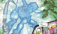 アクアレイダーチーム「<アイアイ!>」 インパルサー「あ!捕虜が逃げるぞ、くそっ!」 捕虜にされていたアクアレイダーチームは、身体を微粒子化させる 「トランスフェイズ・モード」で脱出に成功(右上の画像参照)。 その頃ラヴィナスは、集結したたくさんのマイクロン達が放つ エネルギーの力によって、徐々に姿が変化していった…。