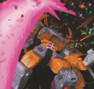 ミッドシップ「<見つけたぞ、赤いの!!>」 レッドライン「コードネーム:ミッドシップか!君たちを 討つには忍びない。引っ込んでいろ!」 ミッドシップ「<だまれ!!貴様など、病んだ細胞の一片にすぎぬ 無価値な存在。滅ぶべき理由しか持たぬ者だ!!>」 レッドライン「どうかな!そうしてお前たちが恐れる理由を 僕らは持っている。今からそれを見せてやろう!!」 ユニクロンと、マイクロン達が合体した光のユニクロンが睨み合う中、 レッドラインとミッドシップの因縁の対決が繰り広げられた。 そして、TF連合軍とユニクロンの戦いは、ついに終結を迎える…。