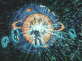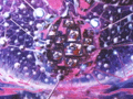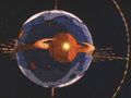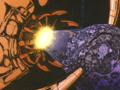 各接合部から青い光が漏れ、トランスフォームが開始される。まず、惑星のリングが北極と南極のジョイントから外れ、左右の軸を中心に90度回転する。次に、惑星の後部が左右に展開し(ロボットモード時の前腕部)、球体の内部に折り畳まれていた脚部(画像左:球体中央の黒い部分)が伸び、各爪(つま先、かかと)が展開。そして、腕部が球面から引き出され、前腕部が上方向にスライドし、巨大な手が露出する。