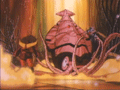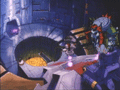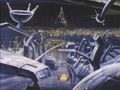 ホットロディマスとチャーはワニ型TFに捕まり、クインテッサ星人の前に連れて行かれた。そこはクインテッサ星人が「法廷」と呼ぶ巨大な円筒形の空間だった。中央のプールには死刑執行を行うシャークトロンが群れで泳いでおり、陪審員の評決の結果「無罪」となると、被告はサメの餌食になる。判決が下されると、光輪状の拘束具を付けられた被告の足元が90度下に折れ曲がり、プールに落ちる仕掛けになっていた。また、このプールの穴は塞ぐことも可能。穴の中には大きなモニターまであり、クインテッサ星人は死が間近に迫る被告と対話することもできた。この惨劇の見える位置に牢獄があり、虜囚は恐怖に怯えながら死を待つしかなかった。 |